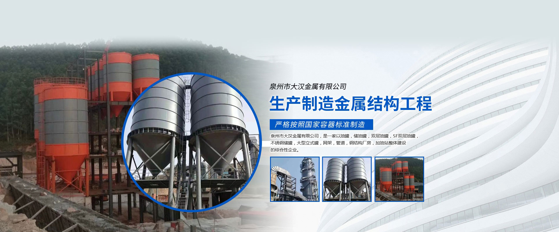 泉州市大漢金屬有限公司,是一家以油罐、儲油罐、雙層油罐、SF雙層油罐、不銹鋼儲罐、大型立式罐、網(wǎng)架、管道、鋼結構廠房、加油站整體建設的綜合性企業(yè)。本公司以技術人員、施工經(jīng)驗豐富的工程隊、自動化設備、擁有鋼結構建筑、螺栓球網(wǎng)架設計安裝技術力量,嚴格按照國家容器標準制造,是一家產(chǎn)品開發(fā)并生產(chǎn)各種壓力容器和制造金屬結構工程,化工石油工程安裝的大型企業(yè)。近多年來,以質量穩(wěn)定、客戶至上、信譽為本,以科技求發(fā)展,贏得廣大客戶支持與信賴。